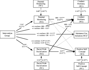 African American couples (N = 139; 67.7 % married; with children between the ages of 9 and 14) were randomly assigned to (a) a culturally sensitive, couple- and parenting-focused program designed to prevent stress-spillover (n = 70) or (b) an information-only control condition in which couples received self-help materials (n = 69). Eight months after baseline, youth whose parents participated in the program, compared with control youth, reported increased parental monitoring, positive racial socialization, and positive self-concept, as well as decreased conduct problems and self-reported substance use. Changes in youth-reported parenting behavior partially mediated the effect of the intervention on conduct problems and fully mediated its impact on positive self-concept, but did not mediate effects on lifetime substance use initiation. Results suggest the potential for a culturally sensitive family-based intervention targeting adults’ couple and parenting processes to enhance multiple parenting behaviors as well as decrease youths’ substance use onset and vulnerability.
