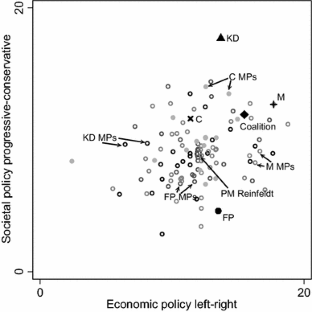 Given the high party unity scores in parliamentary systems, one might critically argue that the high degree of heterogeneity within parliamentary parties that Figs. 1, 2 and 3 show is not realistic and can change when applying a different estimation procedure. However, MPs can have incentives to deviate strongly from the party line in parliamentary speeches to relate to the specific economic situation or the policy attitudes in the electoral district they represent. Such behaviour is less costly than voting against the party line and suitable for sending out signals to the citizens in the electoral districts the MPs represent (see for empirical evidence, e.g., Debus and Bäck 2014; Baumann et al. 2015; Bäck and Debus 2016, pp. 128–135).