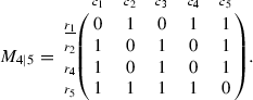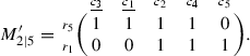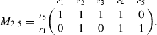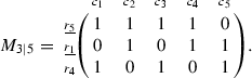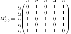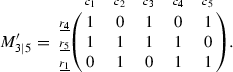 The subscripts in \(M_{5\vert 5}\) indicate the numbers of the rows and columns, respectively. We use \(c_j\) and \(r_k\) to label the row and column indices, so that we can keep track of the qubits after row and column manipulations. The rank of the matrix \(M_{5\vert 5}\) is 2, and the distance of the code is 3 (since any linear combination of its rows or columns has either at least three 1 s or none). We will use the algorithm to find the 3 X-type stabilizers, the 3 Z-type stabilizers, and the 8 auxiliary qubits defined by 8 pairs of auxiliary operators satisfying the canonical commutation relations.