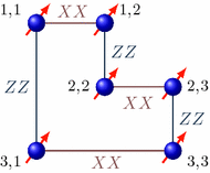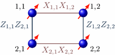Were \(M'_{2|5}\) the starting matrix, the first X-type stabilizer would be \({\tilde{S}}^X_1 = X_{5,3}X_{5,1}\). However, this X-type stabilizer does not commute with some of the Z-type auxiliary operators we introduced before. To obtain the correct stabilizer, we need to iteratively multiply \({\tilde{S}}^X_1\) by X-type operators corresponding to (anti-commuting with) Z-type operators that do not commute with \({\tilde{S}}^X_1\). It does not commute with \(Z_{A5} = Z_{4,3}Z_{5,3}\), so we need to multiply by \(X_{A5} = X_{4,1}X_{4,3}\), which in turn does not commute with \(Z_{A3} = Z_{2,3}Z_{5,3}\), so we need to multiply by \(X_{A3} = X_{2,1}X_{2,3}\). The result is the stabilizer