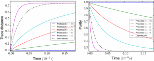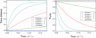 where \(\omega _T= K_\mathrm{B}T/\hbar \). We plot this function with the parameters given in [19]: \(\chi = 3.18 \times 10^{-4}, \omega _c=8\pi \times 10^9\, \mathrm {rad/s}\), and \(\omega _T= 2.2\times 10^9\, \mathrm {rad/s}\) (at \(17\,\mathrm {mK}\)). At zero frequency, i.e., transitions between two states of the same energy, \({\widetilde{C}}_\mathrm {bath}(0) = 2 \pi \hbar ^2 \chi \, \omega _T\) is proportional to the temperature T. The derivative of \({\widetilde{C}}_\mathrm {bath}(\omega )\) is not continuous at \(\omega = 0\) due to the finite cutoff frequency \(\omega _c\). The function \({\widetilde{C}}_\mathrm {bath}(\omega )\) decays quickly once \(\omega \) is smaller than \(-\omega _T\); the transition rate to higher-energy states is low for an energy difference that is several times larger than \(K_\mathrm{B}T\). Consequently, an energy gap as large as several times of \(k_\mathrm{B} T\) can keep the system in the ground state for a much longer time than the gapless case. The asymmetry of the function \({\widetilde{C}}_\mathrm {bath}(\omega )\) (see Fig. 6) can also be used to prepare the initial state when the energy gap is less than \(\hbar \omega _c\) but larger than \(\hbar \omega _T\), as the noise terms drive the system to its ground state while the opposite effect is suppressed.