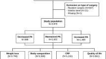 Peak improvements in HRQoL after bariatric surgery are typically observed during the first years of follow-up, followed by a small decline that usually stabilizes approximately 5 years postoperatively [16, 17]. Although HRQoL improves substantially after bariatric surgery, PA usually does not increase (despite great weight loss) [18,19,20], except when self-reported PA is used as an outcome measure [20]. The discrepancy between self-reported and objectively measured PA in this patient group is large, and tends to increase post-RYGB [21]. Consequently, objectively measured PA is the preferred method for assessing actual levels of PA in this patient category.