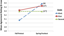 Although gains in knowledge were obtained on the F portion of the measure, in light of the poor reliability of this section of the TKS, we cannot draw strong conclusions about that portion of the teacher knowledge survey. In terms of OL concepts, not focal points of the PD, knowledge remained low at the end of the year with an average of 45% correct at year end. While this final score was significantly higher than the starting point of 40% correct, it represented an average gain of less than one item and probably occurred as a result of occasional questions from teachers about oral language topics.