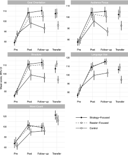 This study aimed to establish (a) whether teaching students revision skills provides benefit over and above teaching strategies for setting explicit goals for the communicative effect of their text, and (b) whether teaching students to adopt specific revision strategies provides benefits over revision instruction that focusses on increasing students’ awareness of audience needs. Six classes of Spanish sixth-grade students (N = 107, 11–12 years) were randomly assigned to one of three conditions. In all three conditions students were taught to set communicative goals. Students in the Strategy Focused condition were then taught a 6-step revision strategy. Students in the Reader Focused condition observed a reader trying to comprehend a text and suggesting ways in which it might be improved. Students in a control condition continued with goal-setting practice. Students’ writing performance was assessed through composition and revision tasks before and immediately after intervention, 2 months post-intervention, and for transfer to an untaught genre. Writing performance and revision skills improved more in the two revision-instruction conditions than for students in the control condition. The improvements were large, persistent and transferred to a different type of text. We found no statistically significant differences between the two revision conditions. Findings suggest that specific revision instruction benefits sixth-grade students’ writing performance and revision skills, but that strategy-focused and reader-focused approaches are similarly effective.