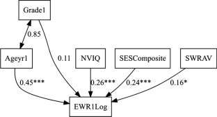 Model 1b of English spelling with standardized coefficient estimates. Ageyr1 = Age in Years; Grade1 = Grade; NVIQ = non-verbal intelligence; SESComposite = Composite score in socioeconomic status; EWR1Log = log-transformed English Word Reading; EDICT1Log = log-transformed English Spelling; SWRAV = parental English literacy skills. *p < .05, **p < .01, ***p < .001