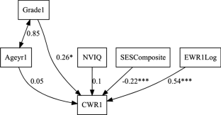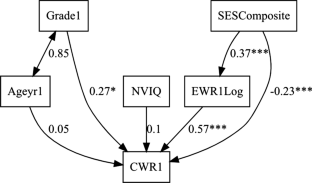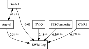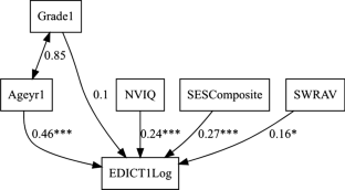 Model 2d of English spelling with standardized coefficient estimates. Note. Ageyr1 = Age in Years; Grade1 = Grade; NVIQ = non-verbal intelligence; SESComposite = Composite score in socioeconomic status; EWR1Log = log-transformed English Word Reading; EDICTLog = Log-transformed English Spelling; CWR = Chinese Word Reading; CDICT = Chinese Spelling *p < .05, **p < .01, ***p < .001