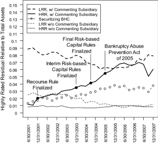 In November 2001, regulators finalized the “Recourse Rule.” The rule lowered risk weights, and therefore commercial bank holding company capital requirements, to 0.2 for holdings of AAA- and AA-rated “private label” securitization tranches, created by investment banks and securitizing commercial bank holding company subsidiaries; risk weights for A-rated holdings equaled 0.5. The rule’s aim was to encourage securitization, but not risk-taking. Regulators indicated that the rule would apply to larger holding companies, without identifying them. Using bank holding companies with subsidiaries that commented on the proposed rule-makings as a treatment variable, average treatment effects from a fully flexible difference-in-differences model indicate that treated banks increased their holdings of the highly rated tranches relative to total assets, while other holding companies, on average, did not. Holding companies with greater highly rated tranche holdings also experienced greater increases in risk after Q1 2008, which suggests that poor performance may have been unanticipated.