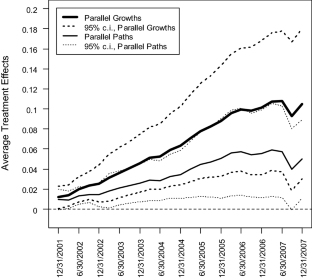 As a robustness check, in unreported results, I estimate average treatment effects for lower rated residual holdings for treated BHCs, and the time paths are relatively flat and zero is always included in the 95 confidence interval. Test statistics indicate that I cannot reject the null hypothesis of common pre-treatment dynamics but do reject the null hypothesis of common post-treatment dynamics. The 95% confidence intervals for all of the average treatment effects under the parallel paths and parallel growths assumptions include zero.