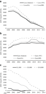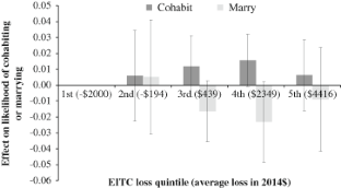 A parallel analysis modeling whether a respondent expects to gain benefits upon marriage is presented in Supplementary appendix Table A6 and provides consistent results with those discussed thus far. Women who expect to gain EITC benefits upon marriage are more likely to marry compared to those who expect to lose benefits upon marriage. Far fewer single mothers expect to gain EITC benefits upon marriage than the share who lose benefits, thus these results are somewhat less precise. Only 22 % of the sample expects to gain any benefits upon marriage, with just 12 % gaining more than $1000.