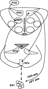 Cao WH, Madden CJ, Morrison SF. Inhibition of brown adipose tissue thermogenesis by neurons in the ventrolateral medulla and in the nucleus tractus solitarius. Am J Physiol Regul Integr Comp Physiol. 2010;299(1):R277–90.