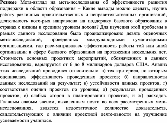 Una meta mirada sobre meta estudios: cuán efectiva es la asistencia al desarrollo para la educación – ¿Qué descubrimientos y qué generalizaciones pueden deducirse de una mirada sobre el trabajo de múltiples organizaciones gubernamentales y no gubernamentales decididas a fomentar la educación básica en países de recursos bajos y medios? Para abordar este interrogante, en este estudio se analizan los resultados de nueve meta estudios de evaluación, completados por organizaciones de asistencia internacionales, donde cada una de ellas examinaba la efectividad de su trabajo sobre educación básica a lo largo de un período plurianual. El valor de las actividades de proyecto sobre el que se basaba su trabajo, revisadas en estas evaluaciones, representa 6 a 8 mil millones de dólares. Los estudios se analizaron en cuanto a (a) qué criterios aplicó cada una de ellas para evaluar el éxito de sus proyectos subyacentes (b) hasta qué medida estos estudios se centraron en resultados y efectos, (c) hasta qué medida estos proyectos se calificaron como sostenibles, (d) si eran adecuadas las evaluaciones a nivel de proyecto que se revisaron, (e) qué lograron los proyectos subyacentes, (f) puntos débiles identificados en los diseños de los proyectos subyacentes y (g) costos. Uno de los puntos débiles importantes, identificados en casi todos los meta estudios revisados, era la falta de pruebas en cuanto al efecto que tuvieron las actividades de proyecto para promover los resultados de aprendizaje de los estudiantes.