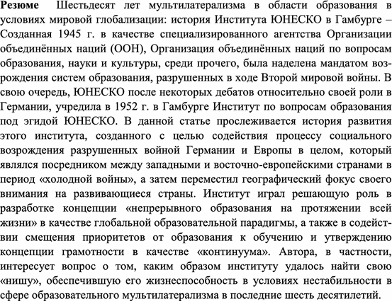 Created in 1945 as a specialised agency of the United Nations (UN), the United Nations Educational, Scientific and Cultural Organization (UNESCO) was given, among other mandates, the task of reconstructing education systems devastated during the Second World War. UNESCO, in turn, and after some debate about an engagement in Germany, founded the UNESCO Institute for Education (UIE) in Hamburg in 1952. This paper traces the development of an institute which was founded to contribute to social renewal in war-torn Germany and Europe, functioned as a mediator between Western and Eastern countries during the Cold War and later shifted its geographical focus to developing countries. The institute was instrumental in conceptualising lifelong learning as a global educational paradigm, as well as in shaping the shift from education to learning and the concept of literacy as a “continuum”. The author is particularly interested in the nature of the institute’s niche which secured its survival in the uncertain domain of educational multilateralism in the past six decades.