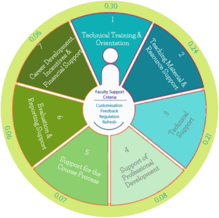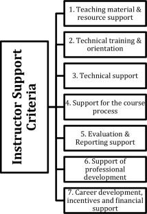 Distance education (DE) has a unique potential to ensure continuity of education in extraordinary circumstances such as pandemics and earthquakes, in addition to its advantages such as flexibility in terms of time and space and self-paced learning options. Institutional support provided for instructors engaged in DE programmes is one of the factors which directly affect the efficiency of DE and the quality of the education provided. This study aimed to determine the criteria of institutional support offered to DE instructors through document analysis, and to reveal the importance weights of those criteria by using the method of multi-criteria decision-making (MCDM). The author examined the standards published by a number of accreditation institutions and international educational organisations for DE, and determined the importance weights of those criteria by applying an analytic hierarchy process (AHP). She determined seven support criteria, namely (in order of importance): (1) technical training and orientation; (2) teaching material and resource support; (3) technical support; (4) professional development support; (5) support during the course; (6) evaluation and report submission support; and (7) career development, incentives and financial support. In presenting her study, the author provides an effective evaluation framework for DE support systems which includes a comprehensive set of indicators based on a literature review and feedback from experts.