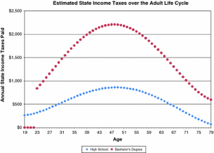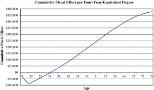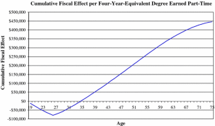 The results in Table 7 and Fig. 4 are derived assuming half-time work and half-time college attendance beginning at age 19. Thus, an associate’s degree is assumed to take 4 years, a bachelor’s degree takes 8 years (i.e., graduation at age 27), and so on. During college these students are assumed to pay half as much taxes, receive half as much unemployment insurance on average, etc. as full-time workers.