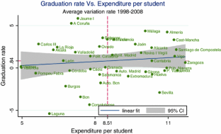 One referee suggested the use of disaggregated expenditure instead of the weighted graduation rate as defined here. We agree that this could be a desirable way to proceed to capture differences at the degree level. Unfortunately, Spanish universities' budgets do not have that level of disaggregation (or at least the information is not publicly available). Hence, with the data we have at hand, we decided to aggregate graduation data in order to have a unique indicator per university and, since we know some shares of the distribution of first-year enrollment and students per type of degree we can construct a not-so-bad proxy of this outcome variable per institution. The alternative suggested by the referee required arbitrarily disaggregating expenditure data per type of degree. This would introduce more noise and bias since the only indicator we can use to guide any possible disaggregation method is the number of students per type of degree. This remains, nevertheless, a very interesting point and a suggestion for future research and we thank the referee for pointing this out to us.