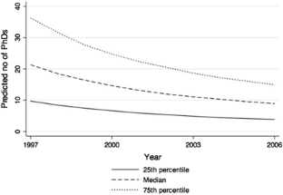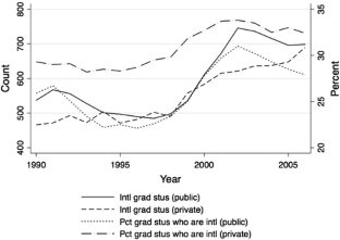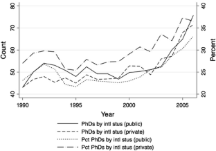 The heightened mobility of resources, ideas, and cultural practices across national borders—commonly known as “globalization”—entails changes in the contexts in which US research universities operate. We draw on recent developments in neo-institutional theory to understand these changes and their implications for the ways in which US universities compete for international doctoral students. Quantitative analyses of university-level data from 1990 to 2006 identify significant predictors of growth in this field, including state appropriations and state-supported research expenditures for public universities and net tuition receipts and number of full-time faculty members for private universities. We also highlight the ways in which returns have intensified, declined, or held relatively constant over time.