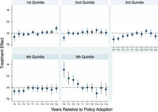 Event study of pre- and post-treatment trends in enrollment by income quintiles and institutional selectivity. The figure plots the estimated coefficients of treatment dummies in the event study model. The dots and spikes illustrate the point estimates and 95% confidence intervals, respectively. a Highly selective institutions; b Moderately selective institutions; c Less selective institutions