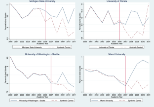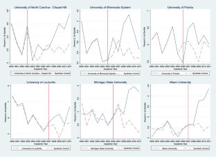 We did not conduct SCM for colleges that adopted the no-loan policy in 2009, because there were not enough post-treatment observations to establish a reliable post-treatment trend. We excluded the College of William & Mary because its synthetic control unit did not fit well with the treated unit during the pre-treatment period.
