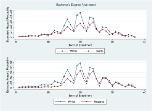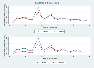 Because the hazard probability of transfer/associate degree completion after 6 years remains statically low, we only track transfer/associate degree completion for 6 years while track students’ bachelor’s degree outcomes for up to 9.25 years.