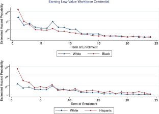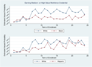 A primary focus among colleges implementing student success reforms has been to increase overall rates of completing any credential and to reduce racial and socioeconomic equity gaps in such completion rates. The focus on general completion may overlook inequities in the type of program students complete, which is particularly significant given the wide variety of credentials offered at community colleges and the resulting variation in labor market returns among completers. Our study examines racial/ethnic stratification among community college students as they enter and progress through programs leading to higher or lower opportunities in the labor market. Using a discrete-time survival analysis and longitudinal enrollment and transcript data. We track enrollment, completion, and transfer for up to 9 years. We also measure achievement of academic milestones (such as credit accrual) along educational pathways associated with higher rates of credential completion and transfer over the long term. Results suggest that a significant gap in the likelihood of bachelor’s degree completion between Black and White students emerges episodically, while the gap between Hispanic and White students develops earlier and remains consistent over time. Results also suggest that, while all students generally benefit from attainment of academic milestones, doing so disproportionately benefits Black and Hispanic students.