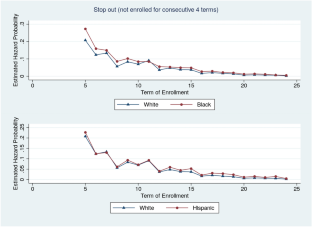 We define stop out as not being enrolled at any institution for four consecutive terms (1 year). We also use two and three terms as alternatives; the results are robust.