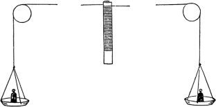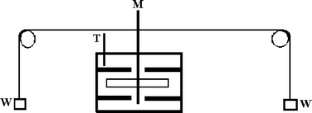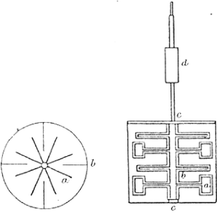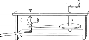 “The axle b [...] was wound with a double strand of fine twine, and the strings [...] were carried over very easily-working pulleys, placed on opposite sides of the axle [...] By means of weights placed in the scales attached to the ends of the strings, I could easily ascertain the force necessary to move the apparatus at any given velocity” (p. 150).