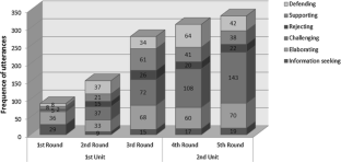 The results of Chi-square goodness-of-fit test are as follows: Defending: not significant at the 0.01 level for first round to second round; χ 2 (1) = 68.3, p < 0.01, for second round to third round; not significant at the 0.01 level for third round to fourth round; χ 2 (1) = 7.79, p < 0.05, for fourth round to fifth round; Supporting: χ 2 (1) = 9728.52, p < 0.01, for first round to second round; χ 2 (1) = 5, p = 0.025, for second round to third round; not significant at the 0.01 level for third round to fourth round and fourth round to fifth round; Rejecting: χ 2 (1) = 45.69, p < 0.01, for first round to second round; χ 2 (1) = 71.69, p < 0.001, for second round to third round; not significant at the 0.01 level for third round to fourth round and fourth round to fifth round.