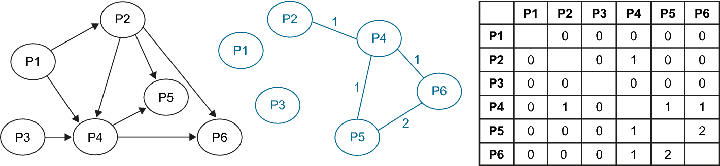 Directed citation network (in black), corresponding undirected co-citation network of publications (in blue), and a matrix representation of co-citations. (Color figure online)