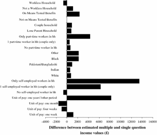 The negative coefficient on the workless family variable being in the opposite direction to the coefficient on families claiming means-tested benefits is an unexpected result. For this reason we also ran the same regression as Model A but this time included an interaction term in an attempt to illuminate this issue but the interaction term was not significant. This was further explored by examining the predicted probabilities for each variation of worklessness and means tested benefits. The results (not shown here) indicate that those families in receipt of means tested benefits, but where at least one partner worked, are particularly likely to record a higher income using the multiple questions (52%), but those who were workless and do not claim means tested benefit are among the least likely to (27%) and to report a lower band using the multiple questions (56%). Although this analysis compares the cleaned (banded) family income variable from the multiple questions with the single question variable, the latter result for workless families not claiming means tested benefits could suggest a residual effect of underreporting of benefits income. Nevertheless, clearly these results demonstrate that the consistency in reporting income between measurement instruments is very much dependent on socioeconomic characteristics.