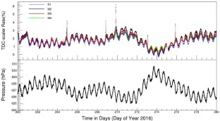 The application of the FFT filter on the TDC-scaler rate has effectively isolated the pressure modulation from the coupled solar modulation in the TDC-scaler rate, allowing a more accurate measurement of \(\beta _{P}\). In this appendix, we demonstrate the effectiveness of this method over the conventional method. Figure 13 shows both the conventional method and the FFT filter method, the fitting of a linear function is most suitable, and the fit quality is better for the FFT method. The estimated \(\beta_{P}\) during three months of observation using both methods are given in Table 4, from these values we can see how consistent and effective is the FFT method for estimating \(\beta _{P}\). Using the conventional method, the estimated \(\beta _{P}\) values are not consistent, the deviation is much higher than the required accuracy of HAWC TDC-scaler system, whereas the FFT method estimated the \(\beta _{P}\) with an accuracy within the required limits. The variation of \(\beta _{P}\) using the conventional method is due to the presence of solar modulation, this method was not able to decouple the solar modulation from the atmospheric one.