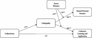Unlike past research which has mainly examined whole school or whole department professional learning communities, this study focused on factors related to effective collaborative practices within teacher learning teams. Our main objective was to ascertain the roles of team value orientations (collectivism and power distance) and team collegiality in explaining team collaboration. Based on data obtained from 207 learning teams, structural equation modelling demonstrated that team collectivism had a positive effect on team collegiality. In addition to being a significant positive predictor of team collaboration, team collegiality was also found to mediate the effects of team collectivism on team collaboration. Although we did not detect any significant direct or indirect effect of team power distance on team collegiality or team collaboration, latent interaction analysis identified team power distance as a moderator of the relationship between team collegiality and teacher collaboration. It was found that the positive effects of team collegiality on team collaboration were stronger for teams with lower levels of power distance. Our findings draw attention to the important roles of team value orientations and collegiality in the context of teacher professional learning. Implications for teacher professional development and directions for future studies were also discussed.