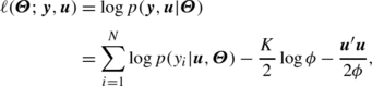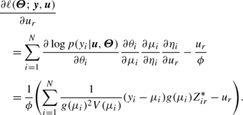 where logp(y i |u,Θ) is the conditional loglikelihood of the data given the random effects. Since the conditional distribution of u is proportional to the joint distribution of (Y,u), the conditional mode of u can be located by maximizing the joint loglikelihood in (3.6) with respect to u. We denote g(μ)=∂η/∂μ. From (3.6), we can compute the derivative of the joint loglikelihood with respect to u r , the r th element of u, as