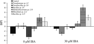 Plant growth promoting bacteria inoculation is a new explored biotechnological tool for in vitro systems with positive impacts in micropropagation. The aim of this work was to study plant growth promotion ability of putatively endophytic bacteria previously isolated from Handroanthus impetiginosus on in vitro rhizogenesis of this tree. Rooting experiments were performed with shoots induced or not with 30 μΜ IBA for 3 days. Then they were transferred to half-strength MS (Murashige and Skoog in Physiol Plant 15:473–497, 1962) salts with B5 vitamins (Gamborg in Exp Cell Res 50(1):151-158, 1968), and inoculated with one of the putative endophytic strains (Pseudomonas sp. (L2), Paenibacillus sp. (L6), Bacillus sp. (L9 and L15), Methylobacterium sp. (L10) or Rhizobium sp. (L12)). Non-inoculated treatments were controls. Rooting percentages were recorded periodically. Biometric and biochemical parameters were measured at the end of the experiment. Also a biometric parameter index was constructed. Experiments showed that inoculation with Rhizobium sp. L12 and Paenibacillus sp. L6 significantly increased rooting percentage, whereas Rhizobium sp. L12 and Bacillus sp. L15 improved aerial and root parameters. Protein and lignin contents were also modified in inoculated plants. In conclusion, putatively endophytic bacteria isolated from ex vitro H. impetiginosus promoted in vitro rooting, increased biometric parameters and modified some biochemical components, and these strains could be used as biofertilizers for sustainable agriculture.