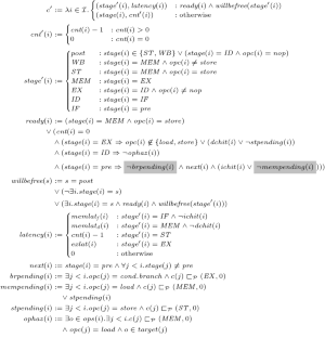 For stage pre, \(\lnot a.\textit{ready}(i)\) requires either \( brpending (i)\), \( mempending (i) \wedge \lnot ichit (i)\), or \(\lnot \textit{next}(i)\). In all three cases an argument analogous to \( ophaz \) applies. If there is a branch j pending in a, j is also a pending branch in b as \(a(j) \sqsupseteq _{\mathcal {P}}b(j)\). If there is an older instruction \(j < i\) to be fetched next, j is also in the pre stage in b and is to be fetched next in b. If a memory operation j is pending in a, j is also a pending memory operation in b as \(a(j) \sqsupseteq _{\mathcal {P}}b(j)\). Thus, if any of the three expressions above evaluates to true for a, it also evaluates to true for b resulting in \(\lnot b.\textit{ready}(i)\). This is a contradiction.