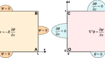 where \(\kappa _{\mathrm{m}} = \lambda _{\mathrm{m}}/(\rho _0 c_p)_{\mathrm{f}}\) is the thermal diffusivity of the saturated porous medium. We denote the vertical unit vector by \({\mathbf {k}}\), directed upwards.