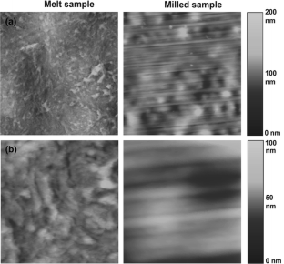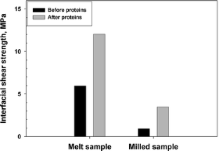 Medical-grade UHMWPE samples with two different surface finishing treatments, milling and melting/reforming were exposed to 10% bovine serum albumin solution and their friction responses were quantified using atomic force microscopy. The observed friction increase upon exposure to proteins was attributed to the formation of a layer of denatured proteins on the surface. Changing the crystallinity and surface energy of UHMWPE affected the protein adsorption mechanism and the resulting increase in friction behavior.