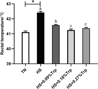 The present study was conducted to investigate the effects of tryptophan (Trp) supplementation on rectal temperature, hormone, and cytokine levels in broilers subjected to acute heat stress. A total of 300 18-day-old female Arbor Acres broilers were randomly allocated to five dietary treatment groups with six replicates per treatment group and ten birds per replicate. Broilers were fed a basal diet and in the thermoneutral conditions (TN, 23 ± 1 °C) was considered as the TN group. Broilers were fed a basal diet and exposed to acute heat stress (HS, 34 ± 1 °C) was regarded as the HS group, and other broilers exposed to acute heat stress (34 ± 1°C) were fed a basal diet supplemented with 0.09%, 0.18%, and 0.27% Trp. Results indicated that acute heat stress increased the rectal temperature (P < 0.05), enhanced the concentrations of corticosterone (CORT), dopamine (DA), adrenaline (Adr), adrenocorticotropic hormone (ACTH), and corticotropin-releasing hormone (CRH) in serum (P < 0.05), and elevated the levels of serum tryptophan hydroxylase (TPH)1, tryptophan 2, 3-dioxygenase (TDO), indoleamine 2, 3-dioxygenase (IDO), and kynurenic acid (P < 0.05), compared with the TN group. Meanwhile, acute heat stress increased the levels of serum Trp, hypothalamic Trp, 5-hydroxytryptophan (5-HT), and interleukin-22 (P < 0.05) relative to the TN group. However, compared with the heat stress group, Trp supplementation decreased the rectal temperature of heat-stressed broilers and dietary 0.09% Trp supplementation decreased the levels of serum CRH and TDO (P < 0.05), increased the levels of serum Trp and IL-22 (P < 0.05) in heat-stressed broilers. In addition, dietary supplemented with 0.18% Trp reduced the levels of serum DA, Adr, noradrenaline (NA), CRH, TDO, IDO, kynurenic acid, IL-1β, and hypothalamic 5-HIAA/5-HT (P < 0.05), increased the levels of serum Trp, 5-HT, and IL-22, and upregulated the concentrations of hypothalamic Trp and 5-HT in heat-stressed broilers (P < 0.05). Moreover, dietary 0.27% Trp supplementation decreased the levels of serum DA, CRH, TDO, and hypothalamic 5-HIAA/5-HT (P < 0.05), and upregulated the levels of serum Trp, 5-HT, IL-22, hypothalamic Trp and 5-HT in heat-stressed broilers (P < 0.05). Taken together, dietary 0.18% Trp supplementation may be the optimal level for broilers reared under acute heat stress.