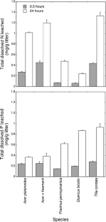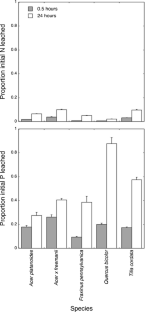 Leaf litter may be an important source of nutrients to stormwater and ultimately contribute to eutrophication of surface waters associated with urbanization. Thus, understanding decomposition and nutrient release from leaf litter that falls on impervious surfaces is important for stormwater management. However, few studies have examined leaf litter decomposition in the unique urban environment of the street gutter. We compared decomposition of leaf litter of five street tree species in a parking lot gutter in St. Paul, Minnesota, USA. In contrast to our expectations, comparisons with past studies revealed that litter decomposed more rapidly in the gutter than in nearby natural areas. And decomposition rates were as rapid as those measured in other urban settings (forests and streams), with most species losing 80 % of their initial mass after 1 year. Litter of most species had retained more than half of its initial N and P after 1 year. However, in contrast to N, litter P dynamics largely were uncoupled from litter mass dynamics, with litter P increasing and decreasing unpredictably over the year. Short-term (24 h) laboratory studies revealed that litter had the potential to lose a high fraction of its initial P, with high variation among species (from 27 to 88 %), and a smaller fraction of its initial N (<10 %) via leaching. Thus, street tree species may differ in their potential contributions to nutrients that are released during decomposition. Our results suggest that careful selection of street tree species and timely removal of litterfall have significant potential to reduce nutrient fluxes from streets to storm drains, particularly for P.