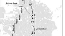 Located in the Great Salt Lake Basin of northern Utah (Fig. 1), the Jordan River is an 82-km regulated urban river that connects Utah Lake (40°53′N 111°58′W; 1368 m elevation) to the Great Salt Lake (40°21′N 111°53′W; 1283 m elevation). The Jordan River Basin has a cold (avg. annual temp 12.7 °C) semi-arid climate with mean annual precipitation of 472 mm, most of which occurs as snow (U.S. Climate Data 2015). The channel in the upper river is largely unshaded (width ~16–32 m; Table 1), while the lower reaches have a more extensive and mature riparian corridor (width ~ 16–39 m; Table 1). The river is regulated by pumps at Utah Lake and flows north through four of Utah’s six largest cities. The greater watershed (including Utah Lake; 9900 km2) is home to around 1.7 million people (1.6 million people in 2013; US Census Bureau 2015). Historically a cold-water fishery, the river is listed as impaired under Utah’s 303(d) list (of impaired water bodies; U.S. code 1313(d)(1)(A)) in 7 of its 8 segments and no longer functions as a cold-water fishery. The river is extremely nutrient rich, where total nitrogen concentrations average 4.2 mg L−1 and total phosphorus concentrations average 0.7 mg L−1 (see Data Supplement). There are 6 major tributaries feeding into the river in addition to at least 8 water diversions removing water. One of these diversions, the Surplus Canal, diverts over half of river flow away from Salt Lake City for flood protection (Fig. 1). Four water reclamation facilities discharge directly into the Jordan River, two of which were encompassed within the study segment.