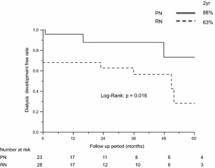 Fifty-one patients (PN 23, RN 28) were evaluated in the present study. Their mean preoperative estimated glomerular filtration rate (eGFR) was 24 ml/min/1.73 m2, and four patients had a solitary kidney. Three of 23 patients (13 %) who underwent PN progressed to requiring dialysis after surgery after a median 16 months. In contrast, 13 of 28 patients (46 %) who underwent RN developed dialysis immediately after surgery (median 2 days). Patients who underwent PN had lower T stages (T1, PN 100 % vs. RN 50 %, p = 0.004) and smaller tumors (31 mm vs. 65 mm, p < 0.0001) than did those who underwent RN. RN and lower preoperative eGFR significantly predicted progression to requiring dialysis, while tumor size and CCI did not.