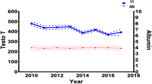 A total of 2874 measurements were made in 8 years, mean participant age 56.18 years (19–84). The study found an age-independent testosterone decline of 10.68 ng/dL (1.6%) per year, displaying drops per year of 13.46 ng/dL (2.5%) in participants ≤ 40 years old, 7.12 ng/dL (1.4%) at the 41–60-year-old age group, and 11.4 ng/dL (2.4%) per year in participants > 60 years old. The values of albumin displayed significant variations along the study period, but without any clear upward or downward trends in post hoc analysis.