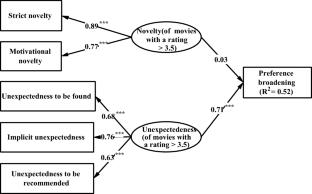 The value indicates that, for example, if popularity rises by one unit, users’ perceived serendipity will decrease by \(|1-{0.821}|*100\%={17.9}\%\), while one-unit increase of day-of-the-week interaction will lead to \(|1-{1.135}|*100\%={13.5}\%\) increase of users’ perceived serendipity.