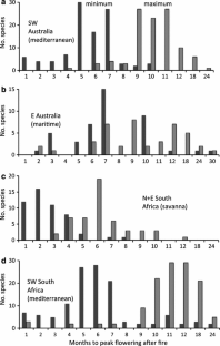 Data on 386 species with fire-stimulated flowering (fsf) in Australasia and South Africa/Madagascar were collated to show that they occur under a wide range of fire regimes, with 71% confined to the mediterranean-climate regions. About 40% only flower up to 2 years after fire (obligate), while the rest continue at a low rate until the next fire (facultative). Peak flowering occurs 5–18 months after fire in the mediterranean regions but at 1–7 months in savannas. Fsf is recorded in 34 families, headed by terrestrial orchids (45% of species), spread throughout the seed-plant phylogeny from cycads to daisies. Tuberous geophytes (essentially orchids) dominate (51%), but other resprouting growth forms include lignotuberous shrubs and forbs, rhizomatous and bunch grasses, leaf succulents, grasstrees, epicormic trees, and hemiparasites. Most have wind-dispersed diaspores (72%), store their diaspores in the soil (93%), and seeds that do not germinate until the next fire (72%). Fsf in association with resprouting takes advantage of optimal resources and minimal competition for growth and reproduction, conditions that favor wind dispersal and maximize the interval for seed accumulation before the next fire and build-up of fire-tolerant organs. Reduced herbivory has little role in accounting for its benefits. The proximal causes of fsf center around cueing factors (direct effects such as ethylene), resource factors (direct and indirect effects, e.g., extra nutrients), and predisposing factors (circumstantial effects, e.g., fire interval). The evolutionary history of fsf has been explored recently in orchids, proteas, blood roots, droseras, and mistletoes and shown to stretch back over a period of at least 50 million years, indicating that flowering in many groups has a long association with fire as an agent of natural selection.