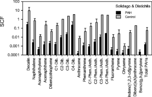Polycyclic aromatic hydrocarbons (PAHs) were measured in two wetland plant species grown outdoors in pots of sediment contaminated with up to 730,000 μg/kg total PAHs. After approximately 3 months, the plants were harvested, cleaned, and analyzed for an expanded suite of PAHs which included both the 16 priority PAHs and 22 alkyl PAH homologs. Sediment and air samples were also collected and analyzed. PAH compounds were detected in all of the samples, with the highest concentrations in the contaminated sediment. The root sample concentrations were generally about one order of magnitude lower than that of the sediment, and were strongly correlated with the concentration in the sediment in which they were grown. The concentrations in foliage were much lower and did not correlate with sediment concentration. Concentrations of low molecular weight PAH compounds detected in the foliage were not significantly lower in plants grown in control sediments, suggesting that the sediment is not the primary source of these PAHs. Several high molecular weight PAHs were detected only in plants grown in contaminated sediment. Plants of both species grown in control sediment were larger than plants grown in contaminated sediment.