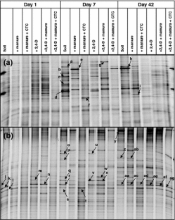 Chlortetracycline (CTC), an antimicrobial compound used in animal production, is not sorbed or degraded in the animal, and may enter the field environment through manure land-spreading. This study determined the influence of a single application of manure with or without CTC on field soil microbial community characteristics. Manures from swine fed unamended or CTC-amended rations were applied at 7,000 kg solid ha−1 to a Brandt silty clay loam soil that had no known prior history of manure application. Soil samples taken 1, 7, 28, or 42 days after treatment (DAT) were analyzed for aerobic culturable counts on R2A agar and most probable number using 2,4-D as sole carbon source. Soil extracts of 1, 7, and 42 DAT samples were subjected to polymerase chain reaction followed by denaturing gradient gel electrophoresis (DGGE) analysis of the V3 region of the 16S rRNA gene pool. Gels were analyzed by Neighbor Joining based on Euclidean distance and Raup–Crick multivariate statistical analysis, and selected bands were extracted to identify predominant community members. Both manure applications initially changed soil microbial diversity, however, communities appeared to converge over time, so that no long-term significant effect was detected with this single application.