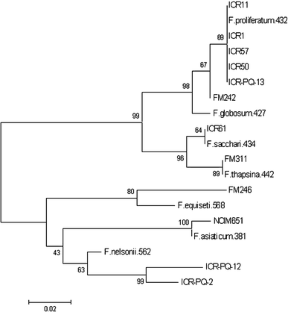 In this study a total of 167 isolates collected from different food materials (68.8% from sorghum and the remaining from various other food materials) were assayed by PCR for amplification of the tri 5 gene present in trichothecene-producing Fusaria. Amplification of the tri 5 fragment was observed in 45 isolates (39 isolates from sorghum and 6 isolates from vegetables). Isolates found positive for presence of the tri 5 gene were classified into different morphological groups based on their cultural and conidial characters; 11 of the tri 5 positive isolates from moldy grains of sorghum, one from each morphology group were selected for further analyses. Five deoxynivalenol producers and three deoxynivalenol and Fusarenon-X producers were detected by analysing culture filtrates of the 11 isolates using GC-MS. One isolate each were identified as producers of NIV alone, or NIV along with DON or DAS toxins. Identification of these isolates to the species level was carried out using spore morphology and sequence comparison of the translation elongation factor 1-alpha (EF-1α) gene against the database as well as using phylogenetic analyses. The isolates were identified as Fusarium proliferatum (6), F. nelsonii (2), F. equiseti (1), F. thapsinum (1) and F. sacchari (1). Amplified Fragment Length Polymorphism (AFLP) based grouping clustered the isolates of same species together. This is the first detailed study of trichothecene production by Fusarium spp. associated with sorghum grain mold in India and the identification of F. nelsonii and F. thapsinum as producers of trichothecenes.