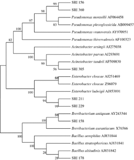 A total of 360 bacteria, isolated from the rhizospheres of a system of rice intensification (SRI) fields, were characterized for the production of siderophore, fluorescence, indole acetic acid (IAA), hydrocyanic acid (HCN) and solubilization of phosphorus. Of them, seven most promising isolates (SRI-156, -158, -178, -211, -229, -305 and -360) were screened for their antagonistic potential against Macrophomina phaseolina (causes charcoal rot in sorghum) by dual culture assay, blotter paper assay and in greenhouse. All the seven isolates inhibited M. phaseolina in dual culture assay, whereas six isolates solubilized phosphorous (except SRI-360), all seven produced siderophore, four produced fluorescence (except SRI-178, -229 and -305), six produced IAA (except SRI-305) and five produced HCN (except SRI-158 and -305). In the blotter paper assay, no charcoal rot infection was observed in SRI-156-treated sorghum roots, indicating complete inhibition of the pathogen, while the roots treated with the other isolates showed 49–76% lesser charcoal rot infection compared to the control. In the antifungal activity test (in green house on sorghum), all the isolates increased shoot dry mass by 15–23% and root dry mass by 15–20% (except SRI-158 and -360), over the control. In order to confirm the plant growth-promoting (PGP) traits of the isolates, the green house experiment was repeated but, in the absence of M. phaseolina. The results further confirmed the PGP traits of the isolates as evidenced by increases in shoot and root dry mass, 22–100% and 5–20%, respectively, over the control. The sequences of 16S rDNA gene of the isolates SRI-156, -158, -178, -211, -229, -305 and -360 were matched with Pseudomonas plecoglossicida, Brevibacterium antiquum, Bacillus altitudinis, Enterobacter ludwigii, E. ludwigii, Acinetobacter tandoii and P. monteilii, respectively in BLAST analysis. This study indicates that the selected bacterial isolates have the potential for PGP and control of charcoal rot disease in sorghum.