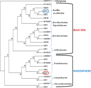 Present study deals with the isolation of rhizobacteria and selection of plant growth promoting bacteria from Crocus sativus (Saffron) rhizosphere during its flowering period (October–November). Bacterial load was compared between rhizosphere and bulk soil by counting CFU/gm of roots and soil respectively, and was found to be ~40 times more in rhizosphere. In total 100 bacterial isolates were selected randomly from rhizosphere and bulk soil (50 each) and screened for in-vitro and in vivo plant growth promoting properties. The randomly isolated bacteria were identified by microscopy, biochemical tests and sequence homology of V1–V3 region of 16S rRNA gene. Polyphasic identification categorized Saffron rhizobacteria and bulk soil bacteria into sixteen different bacterial species with Bacillus aryabhattai (WRF5-rhizosphere; WBF3, WBF4A and WBF4B-bulk soil) common to both rhizosphere as well as bulk soil. Pseudomonas sp. in rhizosphere and Bacillus and Brevibacterium sp. in the bulk soil were the predominant genera respectively. The isolated rhizobacteria were screened for plant growth promotion activity like phosphate solubilization, siderophore and indole acetic acid production. 50 % produced siderophore and 33 % were able to solubilize phosphate whereas all the rhizobacterial isolates produced indole acetic acid. The six potential PGPR showing in vitro activities were used in pot trial to check their efficacy in vivo. These bacteria consortia demonstrated in vivo PGP activity and can be used as PGPR in Saffron as biofertilizers.This is the first report on the isolation of rhizobacteria from the Saffron rhizosphere, screening for plant growth promoting bacteria and their effect on the growth of Saffron plant.