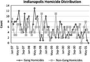 In order to assess the face validity of the gang/non-gang homicide classification in Indianapolis, we compared gang homicide rates in other cities. Since this study relied on the Los Angeles definition of gang homicide, it was important to compare the proportion of gang homicides observed in Indianapolis with that in Los Angeles. Nearly 45% of all homicides in Los Angeles were gang related between 1994 and 1995 (Maxson 1999). In Newark, NJ, homicides were gang related in 40% of the cases between 1999 and 2004 (Pizarro and McGloin 2006). Thus, the proportion of gang related homicides in Indianapolis (51.9%) was consistent with that in prior gang research.
