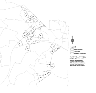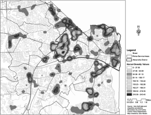 The final geocoding match rate of crime data addresses to x–y coordinates was 91.6% for FCPD and 99.5% for APD. The lower match rate for FCPD could reflect a number of factors, although we suspect it is due to FCPD’s relative newness to crime analysis, mapping, and a new records management system. It may also be due to the varied and expanded geographic terrain of Fairfax County compared with Alexandria City.